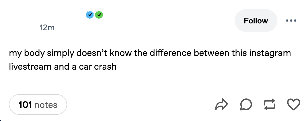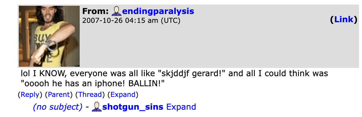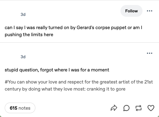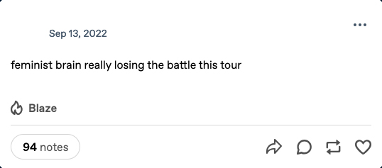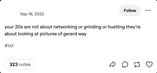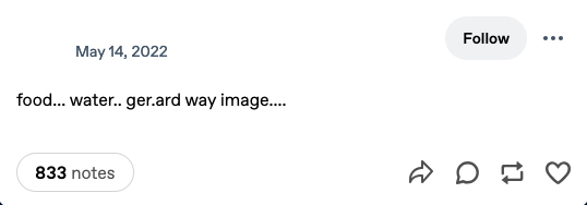These are from the Australia leg of Swarm Tour in March 2023. These shows happened from 2am-6am for a week and I watched every single one via shitty Instagram livestreams even though I had a full time job. I'm pretty sure waking up from deep REM sleep at like 3am to fry my retinas with a live Gerard Way upskirt feed for six days straight left me with permanent brain damage. I felt so connected to not only the 2k people in the livestream with me and the 15k people at the show on the other side of the world, but also to all the fans throughout the history of music fandom who would have committed real, honest to God crimes to experience a nightly livestream pointed straight up their favorite musician's skirt. During MCR's orignal run in the 2000s, fans used their blogs to share shows with each other. LiveJournal is (still) littered with posts from young fans who would get home the night after their show and word vomit every single detail they remembered from the night in the most scattered, unedited form of reporting you can imagine. These posts certainly "drip with desire" (in Catherine Grant and Kate Random Love's words) in some ways, but my contemporary eyes and heart can feel how they're also held back by rock fandom sensibilities of the time. Even on the distinctly feminine LiveJournal platform, I find young women policing their words, their tone, their expressions. They report in a cool tone that "mcr totally kicked a$$ last night" and "played some of the old stuff". God forbid anyone get too excited.